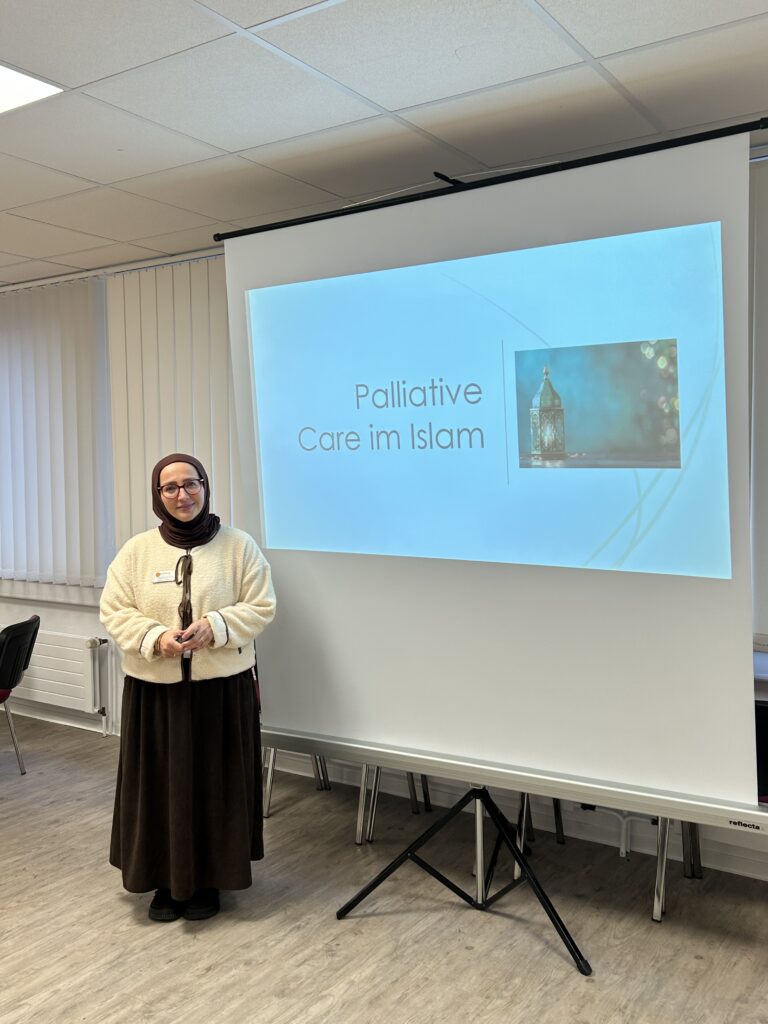 Dieser wurde von der Theologin Kezban Esiyok vom Palliativ Pflegedienst Medidoc gehalten. Dabei erhielten sie Einblicke in religiöse und kulturelle Vorstellungen von Krankheit, Sterben und Tod im islamischen Kontext. Der Vortrag beleuchtet unter anderem die Bedeutung von Geduld, Fürsorge und familiärer Unterstützung sowie den Umgang mit Schmerztherapie und medizinischen Entscheidungen am Lebensende. Für die Teilnehmenden bot diese Veranstaltung eine wertvolle Möglichkeit die Begleitungen von muslimischen Patientinnen und Patienten sensibel und respektvoll zu gestalten. Während des Vortrag gab es schon einige Fragen und am Ende einen sehr regen Austausch . Ein sehr interessanter Abend.